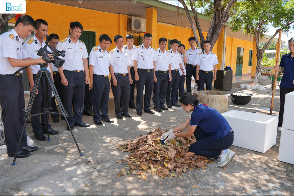 Không chỉ dừng lại ở lý thuyết, chương trình còn tổ chức phần thực nghiệm ngay trong khuôn viên doanh trại. Kỹ thuật viên của BioFix Fresh trực tiếp hướng dẫn chiến sĩ cách phân loại rác đúng cách, phối trộn nguyên liệu hữu cơ theo tỷ lệ phù hợp, sử dụng chế phẩm vi sinh BAC CS-1401 ủ phân Compost để đẩy nhanh quá trình phân hủy và hạn chế mùi hôi.