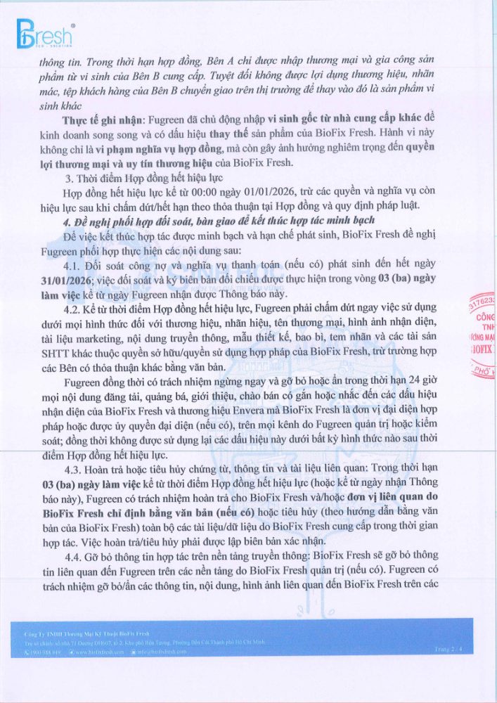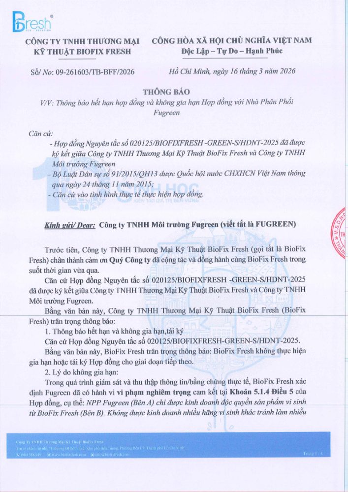 BioFix Fresh chính thức không gia hạn và không tái ký Hợp đồng nguyên tắc số 020125/BIOFIXFRESH-GREEN-S/HDNT-2025 với Công ty TNHH Môi trường Fugreen.