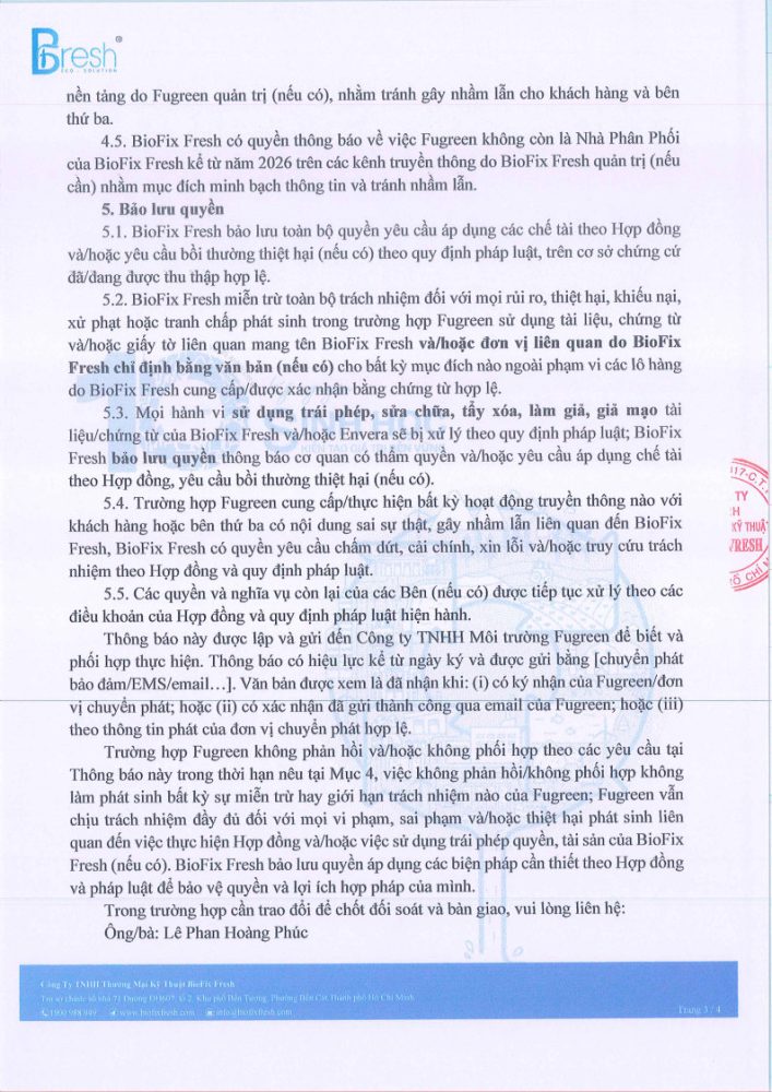 Quyết định này được đưa ra sau khi BioFix Fresh thu thập đầy đủ bằng chứng về việc Fugreen đã có hành vi vi phạm nghiêm trọng nghĩa vụ hợp đồng (Cụ thể là Khoản 5.1.4 Điều 5 về cam kết độc quyền kinh doanh sản phẩm vi sinh từ BioFix Fresh).